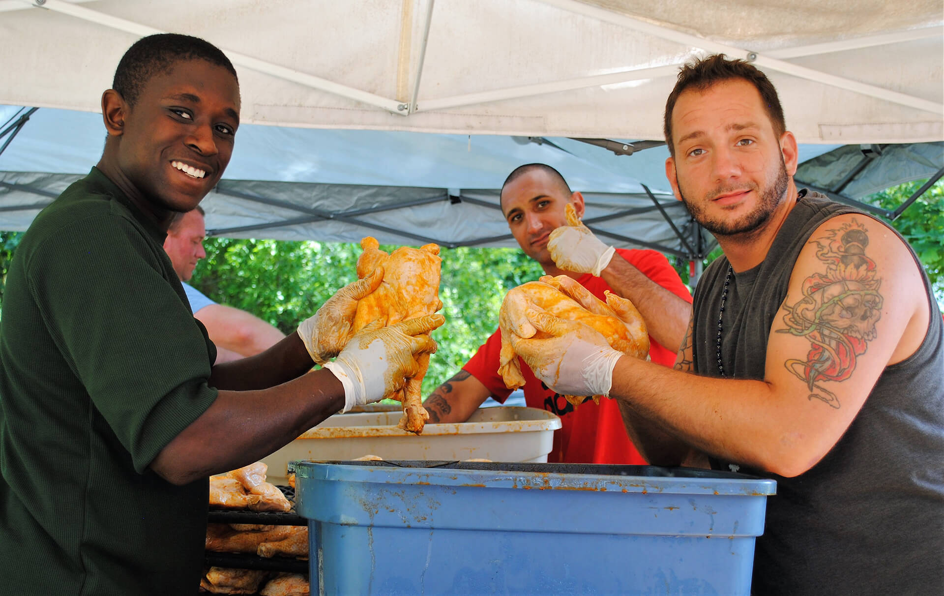 Toward the back of the Legion property, another crew sweated under the rising temperatures moving the huge grills into place, scrubbing them clean, filling them with charcoal, and firing them up in preparation for cooking the 700 split chickens that would be the main course.
