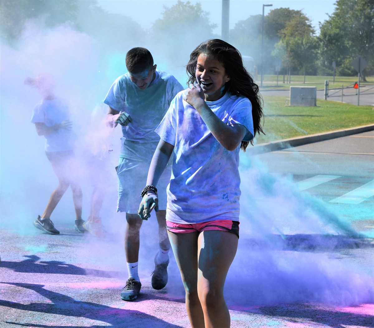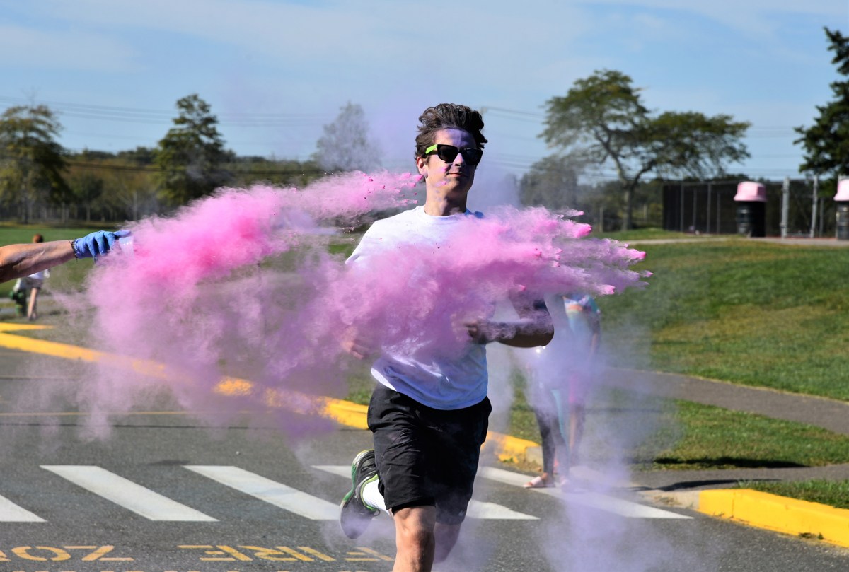 Reds, purples, blues, and greens swirled around East Hampton High School’s track during the third annual community run/walk Saturday, September 21. Attendees wore white September 21 to be decorated with the colors of the non-toxic paint.