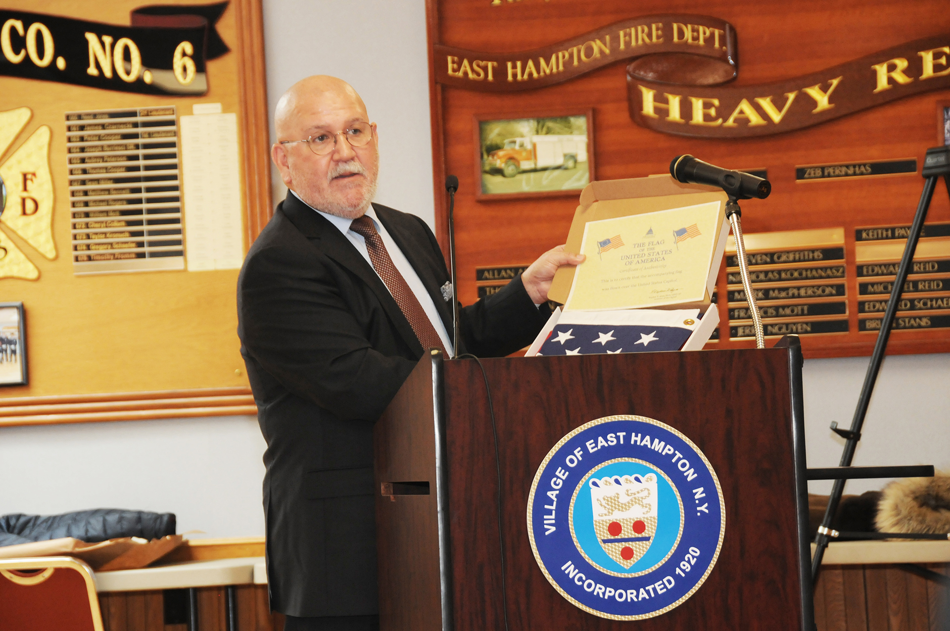 Congressman Lee Zeldin announced, through his district director, Mark Woolley, who attended the meeting, that the congressman plans to have a flag flown at the capitol in Rickenbach’s honor. Several speakers praised the now former mayor for the way he treated others.